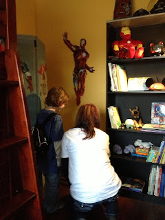 Look at this absolutely gorgeous wall screen that the mother of one of the boys on Brian's soccer team offered to hand paint with all Rowan's favorite super heroes.